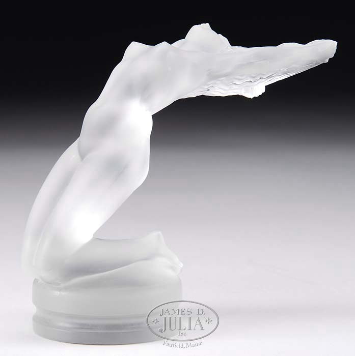 R. LALIQUE CHRYSIS MASCOT. Very fine Lalique Chrysis automobile mascot depicts kneeling nude woman leaning backwards with hair flowing in the wind. Signed on the underside with etched block letters “R. Lalique France”. SIZE: 5″ h. CONDITION: Very good to excellent. 5-67728 (5,000-6,000)