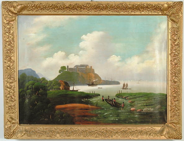 ATTRIBUTED TO THOMAS CHAMBERS (American, 1805-1866) VIEW OF WEST POINT ON THE HUDSON RIVER. Oil on canvas Hudson River scene shows buildings atop rocky bluff with water. Several style boats can be seen on water including river steamboat, sailboats and six men carrying a rowboat through inlet. House on left side surrounded by trees and grassy shoreline. Several masts are seen beyond rocks and sails in distance. Housed in probably its original grape and vine decorated period frame. SIZE: 24” x 32”. CONDITION: Old “C” shaped repair to sky. Some light flaking to left bottom side in trees. Good. 9-94481 (10,000-15,000)