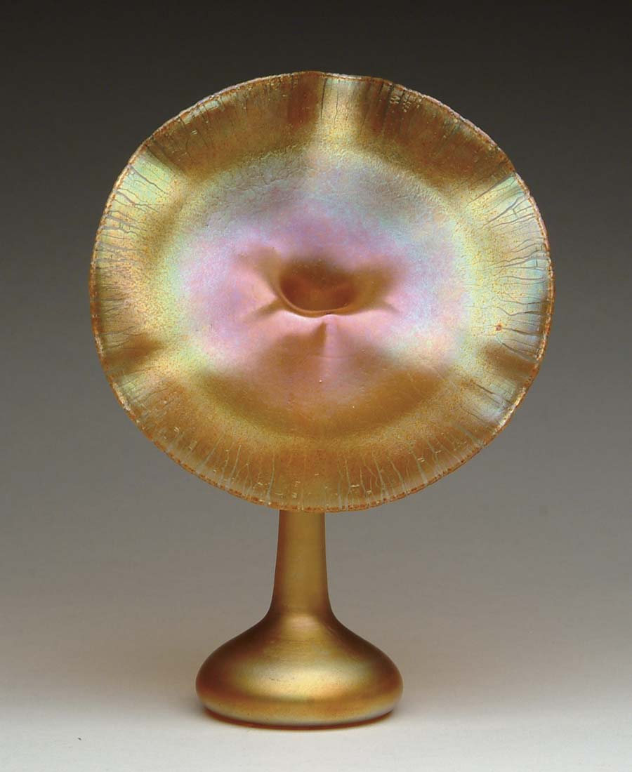 TIFFANY JACK IN THE PULPIT. Beautiful gold favrile jack in the pulpit has large stretched top with nice gold iridescence showing flashes of pink at the center. Signed on the underside “LC Tiffany – Favrile”. SIZE: 9 in. t. CONDITION: Very good to excellent. 5-61100 (4,000-6,000)