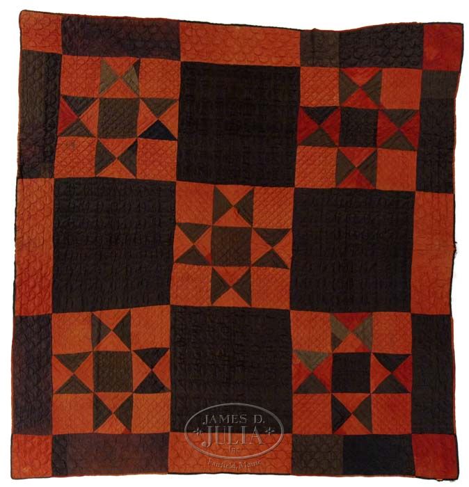 QUAKER SILK WEDDING QUILT. Circa 1830/40 having large black quilted blocks and rust colored blocks with black triangle patterns. The back with a homespun linen. SIZE: 91” x 88”. CONDITION: Considering its fragile nature, very good. 9-90770 SM (2,000-3,000)
