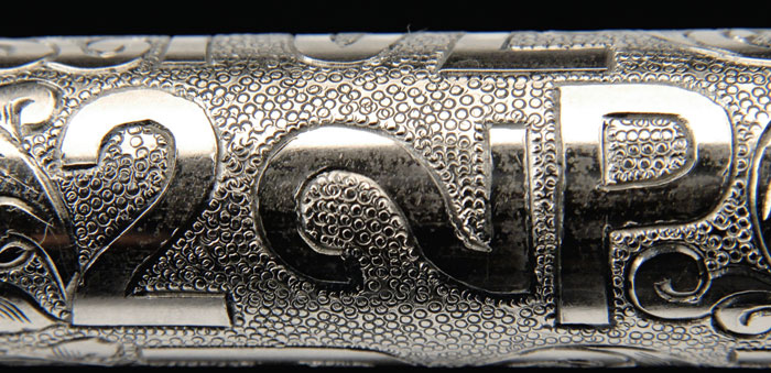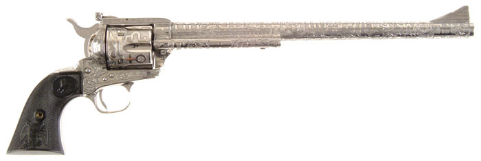 *CASED CATTLE BRAND ENGRAVED COLT NED BUNTLINE COMMEMORATIVE SINGLE ACTION REVOLVER. Cal. 45 Colt. SN NB1170. Nickel finish with 12” bbl, ramp front sight & fully adjustable rear sight on flat top frame. It has 2-pc Rampant Colt & eagle black composition grips. Entire surface of revolver, except front strap, has full coverage engraving of various Texas cattle brands including the famous XIT, DDD, 7UP and the whimsical 2 LAZY 2P, among numerous others. It all has a very nice punch dot background with feather patterns on sides of top strap. Right side of frame, in one of the leaves of a foliate pattern, are initials “WB” which stands for the late Weldon Bledsoe. Mr. Bledsoe essentially succeeded the late Cole Agee, who is recognized as the father of the Texas cattle brand engraving patterns. While the two only met once or twice, it is readily apparent that Mr. Bledsoe at least studied Mr. Agee’s work and incorporated the idea into his own work. Accompanied by a fine Colt custom case with lifting lid over a glass lined top with a locking pullout drawer which contains revolver, six nickel plated dummy cartridges & a Ned Buntline plaque. CONDITION: Exceptionally fine, unfired since custom plating after engraving. Grips are equally new. Case has a few scratches & small nicks but is essentially new. 4-60263 JR605 (3,500-5,000)