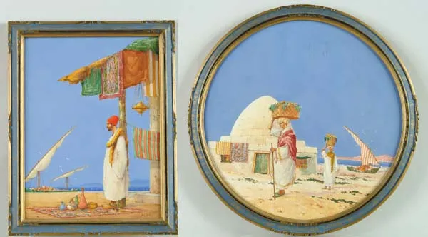 JAMES GREIG (British, 1861-1941) TWO EGYPTIAN WATERCOLORS “POTTERY” AND “THE FRUIT SELLERS”. 1) Rectangular upright view of a man wearing red fez standing on a rug with colorful vases. Stands against post with hanging rugs overlooking boat, ocean and hills. Signed lower right “Jas. Greig” and titled lower left “Pottery”. SIGHT SIZE: 11-1/2” x 8-1/2”. 2) Round framed scene of two people with large baskets of fruit on their heads. They walk beside domed building with rugs hanging, boat is seen on right side overlooking water, hills and town. Titled and signed on bottom “The Fruit Sellers Jas. Greig”. Housed in original period painted and gilt frames. SIGHT SIZE: 12-3/4” dia. CONDITION: Very good. 9-96496 (200-400)