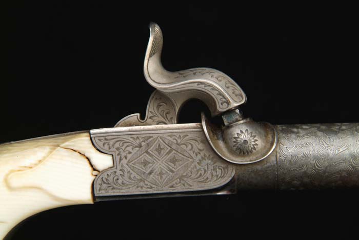 FINE CASED PAIR OF PERCUSSION CLAUDIN MUFF PISTOLS. Cal. 48. NSN. 2” rnd Damascus bbls. Marked “FD CLAUDIN / A PARIS” on top of frame to left of hammer. “LH” is inlaid in gold on both upper tangs. Bbl and frame on one pistol are numbered 1, the other is numbered 2. The frames have floral scroll engraving with four different center vignettes. Bbls have a fine twist Damascus pattern. Ivory grips have raised panels on both sides of action. Cased in an 8-3/4” x 5-3/4”ebonized mahogany veneer box with German silver stringing around edges. Same initials as on gun are inlaid in German silver on lid. Case is lined with maroon velvet and has fitted recesses for pistol, combination tool, ivory cap box and ivory powder flask. There are 3 covered compartments, one of which contains key which operates lock. Lock is marked “FD CLAUDIN / RUE DE LA TONNELLERIE 9”. CONDITION: Metal is bright. All four ears of stocks are cracked. There are hairline cracks on the exposed upper surfaces and powder stains on surfaces in contact with the case. Case has numerous cracks with some separations in the lid. Several pieces of German silver stringing are missing. 4-30241 FS125 (5,000-10,000)