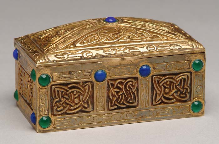 TIFFANY STUDIOS STAMP BOX. Rare Tiffany Ninth Century stamp box has deeply impressed pattern on four sides as well as across the domed top. Sides and top are set with blue and green cabochons while interior of box has original divided stamp tray. Box is finished in rich gold patina. Signed on the underside “Tiffany Studios New York 1624”. SIZE: 3-7/8” x 2” x 2” t. CONDITION: Some very minor discoloration to patina, otherwise very good to excellent. 5-64139 (2,000-3,000)