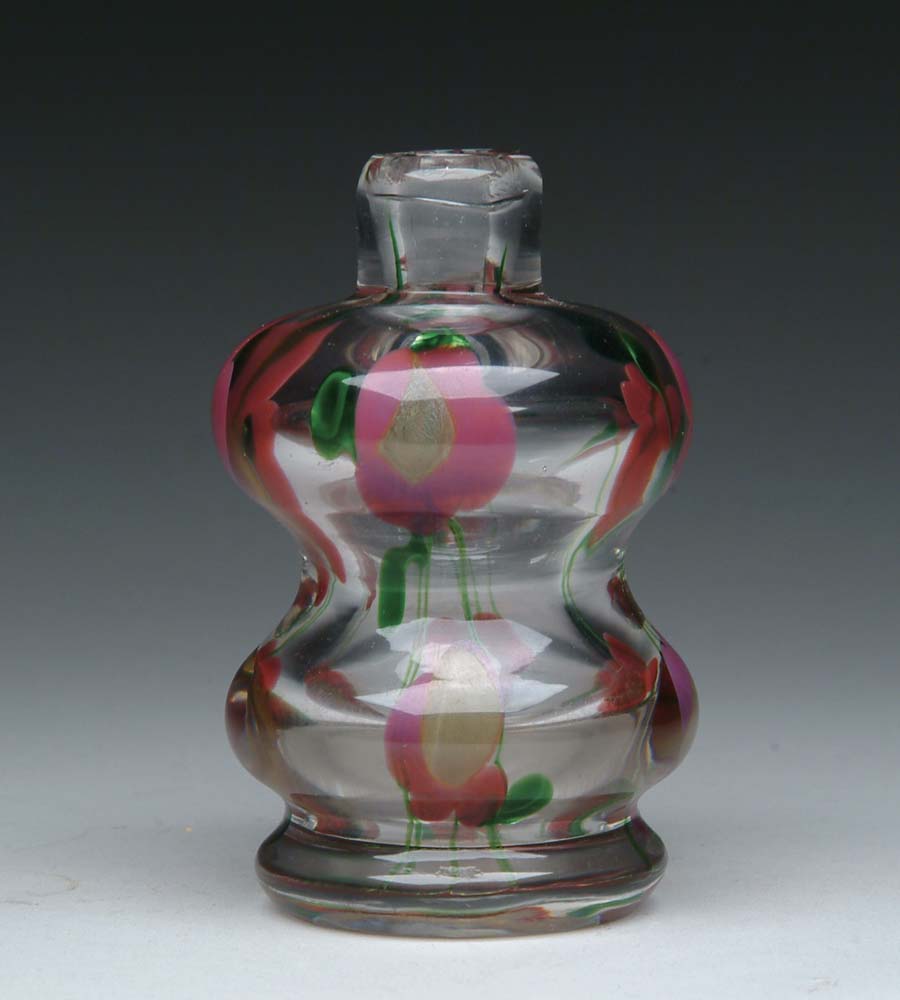 TIFFANY PAPERWEIGHT VASE. Beautiful hourglass shaped vase has raspberry colored flowers with light green centers and dark green stems and leaves all in a clear glass paperweight vase. Signed on the underside “LCT” and “8700C”. SIZE: 4 in. t. CONDITION: Very good to excellent. 5-61299 (10,000-15,000)