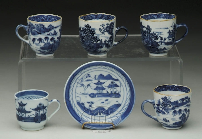 SIX PIECES OF BLUE AND WHITE CANTON. Lot consists of: Four 2-1/2” handled cups (minor nicks on rim ); Small Canton cup and saucer (roughness on edge of saucer). SIZE: Saucer 4”; Cup 2-1/2” h x 2” w. 9-28419 (150-200)