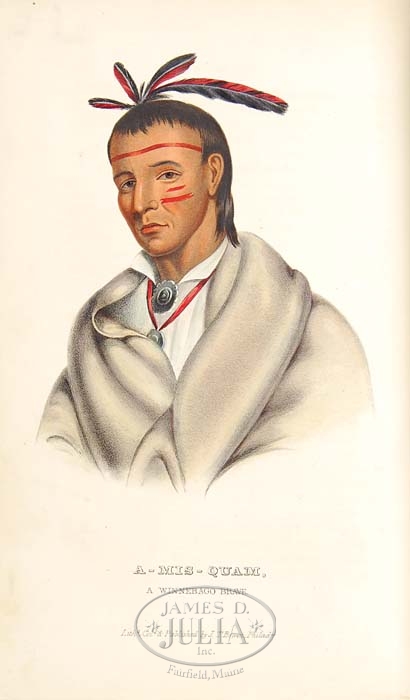 JOHN T. BOWEN (American, 1801-1856) LOT OF EIGHT COLORED NATIVE AMERICAN CHIEFS & BRAVES. Taken from a book and separated, the lot includes the following: Ma-Ka-Tai-Me-She-Kia-Kiah, Saukie Brave; Keokuk; Red Jacket a Seneca War Chief; Asseola Seminole Leader; Wa-Kawn A Winnebago Chief; Pa-She-Nine A Chippewa Chief; A-Mis-Quam A Winnebago Brave; Pee-Che-Kir A Chippewa Chief. All are beautifully colored and published by JT Bowen, Philadelphia. Along with a colored print of Red-Bird, a Winnebago with no publisher. SIZE: Page is 10″ x 6-1/2″. CONDITION: Very good. 9-91223 (2,000-3,000)