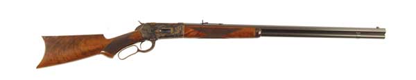 DELUXE WINCHESTER MODEL 1886 LEVER ACTION RIFLE. Cal. 40-82. Spectacular deluxe rifle with 28” oct bbl, full magazine, highly figured deluxe walnut with checkered forearm and black insert pistol grip stock with crescent steel buttplate. It has an ivory bead front sight with semi-buckhorn rear sight. The entire rifle has been completely and spectacularly restored by Doug Turnbull recreating exact Winchester case colors and blue. Bbl either had the address and caliber re-rolled or it is a replacement bbl as the lettering is crisp with raised metal around it. Accompanied by Cody Museum yellow sheet. SN 64927. CONDITION: As noted, retains virtually all its brilliant restored finish to both metal and wood with one or two minor nicks to the wood. Brilliant shiny bore. 4-49965 JR217 (10,000-15,000)