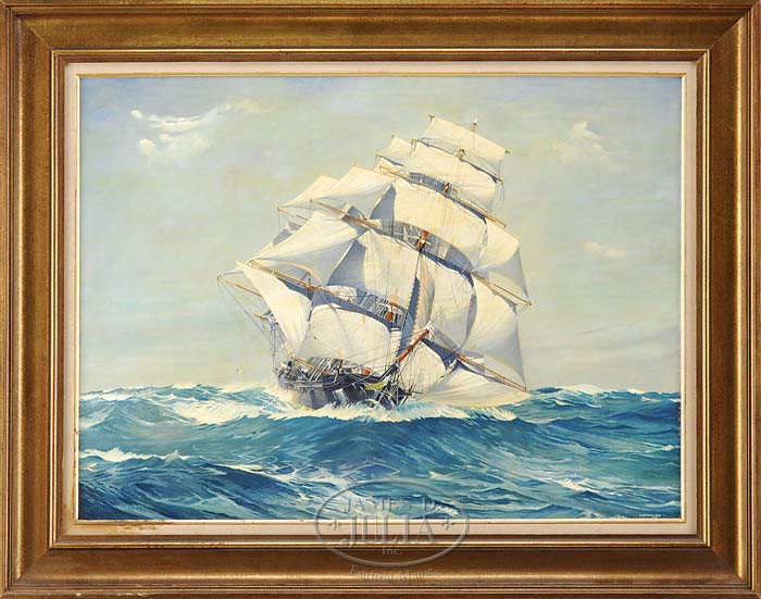 CHRISTIAN SPURLING (English, 20th Century) TWO WORKS: SHIPS AT SEA. 1) Oil on illustration board scene shows a tall ship in full sail sailing slightly to the right in an oncoming view in blue ocean with blue and white sky. Signed bottom right “C Spurling 1972”. 2) Oil on illustration board showing a fully rigged and sail three-mast tall ship sailing right to left in blue white capped ocean under blue and white cloud sky. Signed lower right “C Spurling 1973″. The ship has a red cross on one sail and flies the American flag. Both identically housed in gilt wood frames with white and gold liners. In the British army, Spurling was captured at the fall of Singapore and as a prisoner he worked on the infamous Bridge over the River Kwai. SIZE: 22″ x 30”. CONDITION: Very good, some yellowing to varnish. 9-95140 (1,000-1,500)