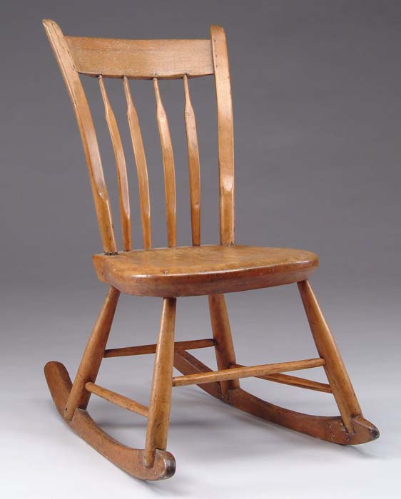THUMB BACK WINDSOR ROCKER. Plank seat with four arrow-type curving spindles, striped to natural finish. SIZE: 30-1/2” h. Seat: 15” h. CONDITION: Rockers flattened. Generally good. 9-72458 (100-200)