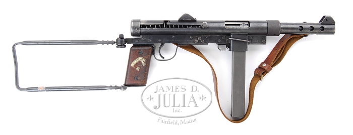 ***DS EGYPT GOVERNMENT ARSENAL PORT-SAID SUB MACHINE GUN PRE 86 DEALER SAMPLE. SN 001. Cal. 9mm. An original Egyptian Port-Said 9mm sub machine gun. Imported by P.O. Bello Armamentos, Inc. Protected post front sight adjustable for windage and elevation. Three position blade rear sight. All metal is a dark blue finish including side folding wire stock. Includes leather sling, and one stick magazine. PROVENANCE: Stern Collection. CONDITION: Fair. Heavy blue coverage on all exposed metal parts with some fading. Dings, scratches, and marks from handling and storage. Wire stock locks open, and closes tightly. Wooden grips are in good condition although both have illegible yellow paint marks. Open bolt full auto mechanism functions well when cycled by hand. Bore is pitted but retains deep rifling. 4-34637 JZ41 (3,500-4,500)