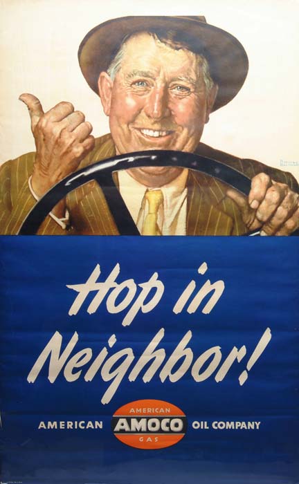LOT OF TWO AMOCO POSTERS. Large paper posters, ca 1950s for Amoco American Oil Company including one with Uncle Sam behind the steering wheel with the Amoco logo, below which states “Uncle Sam rides First”. Image by C. Bream. The second poster shows a smiling blue eyed gent behind the wheel as if looking through the windshield, pointing his thumb, telling the viewer to “Hop in Neighbor!”. Image by Norman Rockwell. SIZE: Each measure 26-1/2” w x 42-1/2” h. CONDITION: First poster shows small area of loss to upper left corner, and minor nibbles otherwise very good to near excellent. Second poster shows small cut line at left edge and tiny fleabites to lower left, otherwise near excellent. AT 1-7020, 1-7021 (300-500) Auction: Advertising, Toy & Doll - Fall 2006 Please Note: All prices include the hammer price plus the buyer’s premium, which is paid by the buyer as part of the purchase price. The prices noted here after the auction are considered unofficial and do not become official until after the 46th day. |
