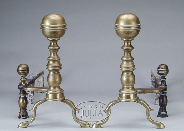 PAIR OF ANTIQUE BRASS BALL TOP ANDIRONS WITH TOOL SET. Andirons with matching log stops and long dogs. Later edition ball top tool set, which does not match andirons but has similar design. Tools include holder, shovel, poker and tongs. SIZE: Andirons 16” h x 27” l. CONDITION: Some dents to ball tops, otherwise good. 9-27799 (200-400)