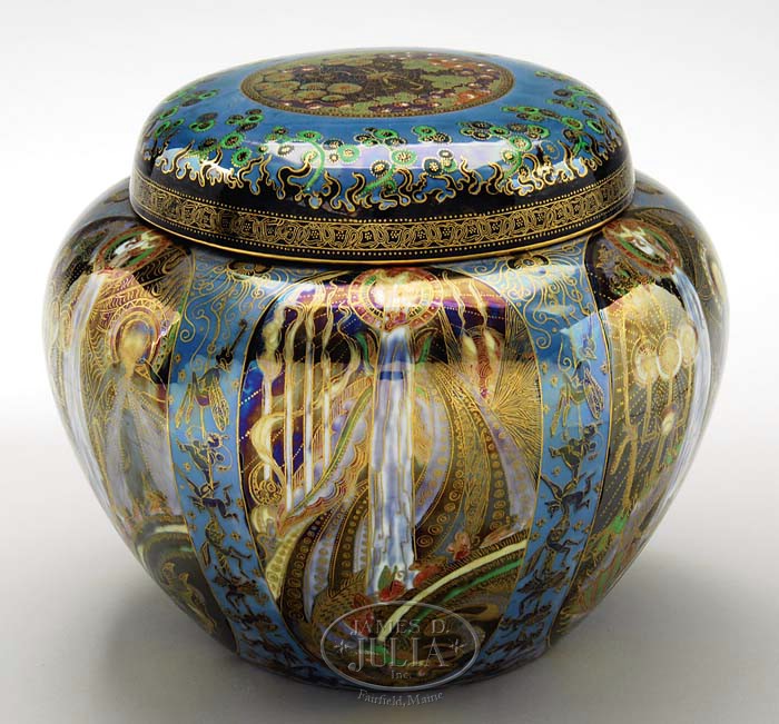WEDGWOOD FAIRYLAND LUSTRE MALFREY POT. Exceptional large Wedgwood Fairyland Lustre malfrey pot is decorated in the Candlemas pattern with six panels, each decorated with a white candle extending upward from a blue and green coiling dragon. Each panel has a midnight background and is highlighted with gold gilt details. Each panel is separated by a light blue vertical border decorated with black fairies trimmed in gold hanging from a vine. The domed lid has a center midnight lustre medallion with spiderweb and center spider and green, purple and mauve flowers with gold highlights. The light blue background gives way to a midnight lustre flame border. Interior of the lid is further decorated with a green medallion having center large spider all against a mother of pearl background. The malfrey pot is finished with a wonderful bright lustre glaze. Signed on the bottom with Portland vase mark and “Wedgwood England”. SIZE: 9-1/2″ t x 10-1/2″ dia. CONDITION: Very good to excellent. 5-67319 (30,000-40,000)