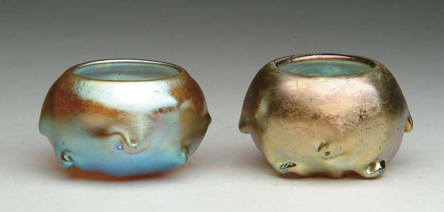 TWO TIFFANY SALTS. Very nice pair of Tiffany salts has pigtail design circling the salts with rich gold iridescence showing flashes of blue. Signed on the underside “LCT”. SIZE: 1-3/4 in. dia. CONDITION: Very good to excellent. 5-61533 (900-1,200)