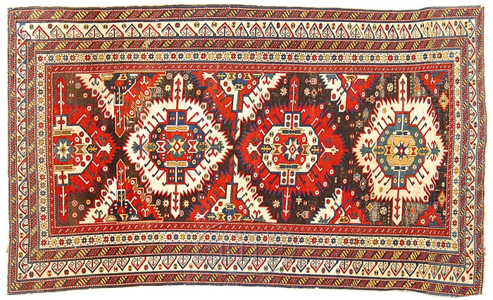 KUBA ORIENTAL RUG, EAST CAUCASUS. Last quarter 19th century. The black field enclosing red, blue, and ivory medallions within polychrome borders, finely woven overall. SIZE: 6 ft 10 in x 4 ft. CONDITION: Very good condition overall, with minor corrosion of black colors. 9-92984 (2,000-3,000)