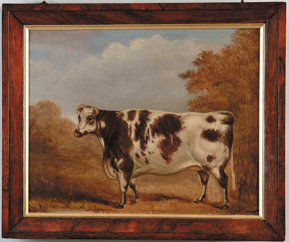 UNSIGNED (British, 19th Century) PORTRAIT OF A BULL. Oil on canvas portrait of a white and brown bull standing in a landscape setting with blue sky and white clouds. Housed in a rosewood and gilt lined frame. SIZE: 18-14” x 22-1/4”. CONDITION: Very good, some minor inpainting. 9-95429 (3,000-5,000)