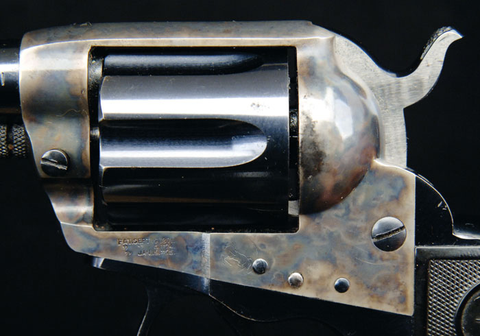 COLT MODEL 1877 THUNDERER DA REVOLVER. Cal. 41 Colt. SN 151406. Blue & case colored with 6” bbl, integral half moon front sight and 2-pc birdhead Rampant Colt hard rubber grips. It has 2-line bbl address with caliber on left side and 3-line patent dates on frame with Rampant Colt in a partial circle. CONDITION: Very fine to extremely fine, all matching. This is a full factory restoration as indicated by the “&” on the right rear web of trigger guard. Bbl & ejector rod housing retain 95-96% glossy factory restored blue and the frame about all of its factory restored case colors, brilliant in sheltered areas, slightly faded elsewhere. Cylinder retains about 98% glossy factory restored blue. Hammer retains most of its niter blue on edges with bright polish on sides. Grip frame retains virtually all of its orig glossy blue with some thinning on butt and slightly dull on trigger guard. Mechanics are crisp, brilliant shiny bore. 4-59068 JR498 (3,500-5,000)
