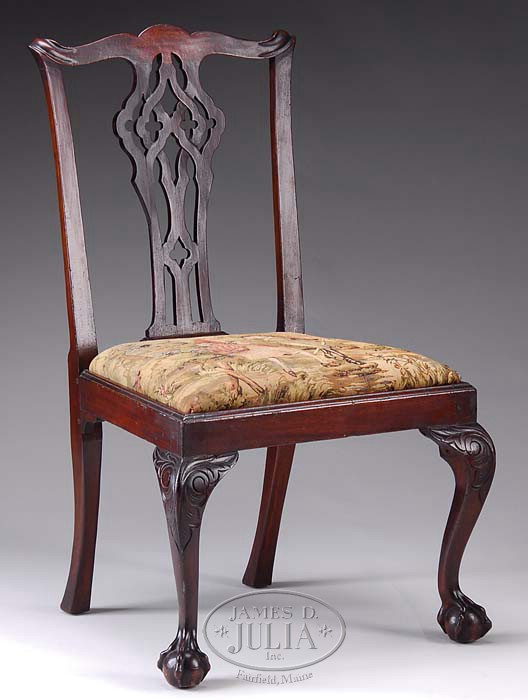 MASSACHUSETTS CHIPPENDALE CARVED MAHOGANY SIDE CHAIR. Last quarter 18th century. Probably Boston or North Shore, the shaped crest rail terminating in scrolled ears above the pierced Gothic splat, joined to a molded trapezoidal frame fitted with a slip seat, raised on frontal acanthus-carved cabriole legs raised on well defined talon-and-ball feet, the rear legs backswept. SIZE: 37-1/2″ h. of back. 18″ h. of seat. CONDITION: With restoration to back splat proper right side, otherwise very good with old polished surfaces; seat frame original. 9-95230 (1,200-1,800)