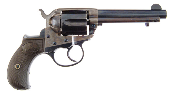 COLT LIGHTNING DA REVOLVER. Cal. 38 Colt. SN 139139. Blue & case colored with 4-1/2” bbl, 2-line address and caliber on left side. It has 3-line patent dates and Rampant Colt in a circle on left side of frame. It has Rampant Colt birdhead hard rubber grips. CONDITION: Very fine, all matching. Bbl retains about 90% glossy orig blue and ejector rod housing about 40% orig blue with balance flaked to a dark patina and a spot of pitting. Frame retains most of its orig case colors, brilliant in sheltered areas, moderately faded, turning silver on top strap. Cylinder retains 92-93% orig blue, slightly thin. Trigger guard retains 95-96% glossy orig blue with three spots of pitting and backstrap about 85% orig blue. Screwheads are untouched and retain nearly all of their bright niter blue as does back edge of hammer. Grips are sound and show light to moderate wear with right side turned chocolate. Mechanics are fine, bright shiny bore with a few spots of fine pitting. 4-59069 JR500 (3,000-4,000)
