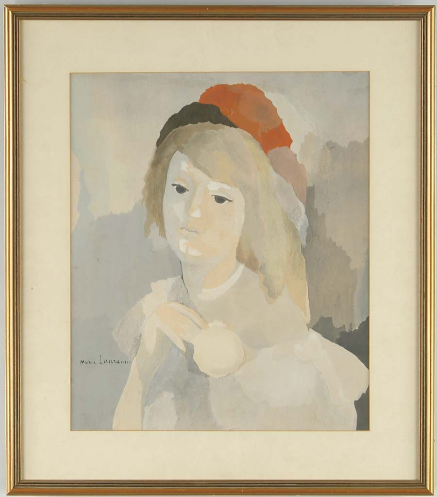 MARIE LAURENCIN (French, 1885-1956) PORTRAIT OF A GIRL. Gouache on paper half portrait of a girl with a colorful red and black beret. It appears that she is wearing a cape with large ball decoration at front. Signed lower left. The paper has been glued to the matte and appears to been removed from an artist sketch pad and one side trimmed while on matte. Housed in a modern decorated wood frame. PROVENANCE: From a Houlton, Maine Estate. SIGHT SIZE: 17-1/2” x 14-1/2”. CONDITION: Very good. 9-96285 (300-500)