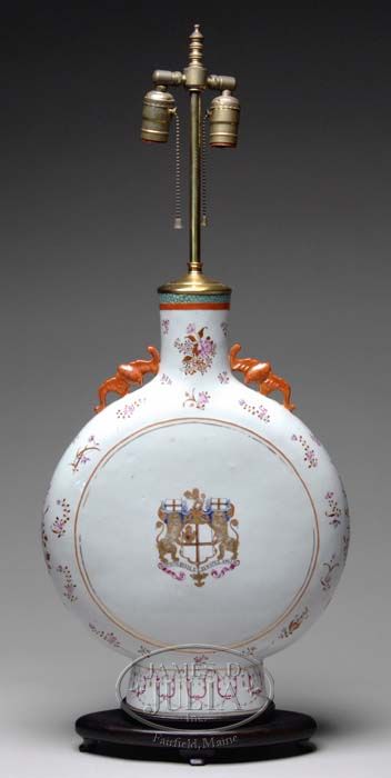 CHINESE EXPORT PORCELAIN ARMORIAL “MOON” VASE, MID 19TH CENTURY. The circular body with reticulated handles, polychrome painted floral sprays centering an armorial crest inscribed: “AUSPICIO . REGIS. ET. SENATUS . ANGLIA”. The reverse decorated with a western couple in period dress with cockatoo within a scrolled cartouche. Now mounted as a lamp. SIZE: 20” h of vase x 14-1/4” w x 4-1/2”d. CONDITION: Overall very good. 9-90528 MD (1,200-1,800)
