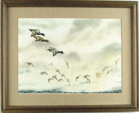 ART COOK (American, 20th Century) DUCKS LANDING. Large watercolor scene shows eighteen ducks coming in to land in fog shrouded water. Three ducks angling in from top left. In great detail. Others nearing water with other ducks landing. Small blind is seen in center of water. Signed lower right. Housed in a distressed molded wood frame with decorative double matte. SIGHT SIZE: 20-1/4” x 28”. CONDITION: Very good. 9-96067 (900-1,200)