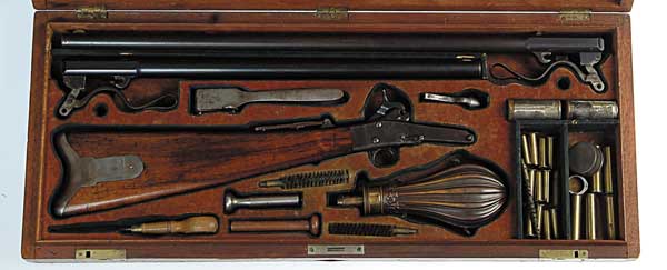 CASED MAYNARD FIRST MODEL RIFLE SHOTGUN SET. Cal .35. 26” part oct bbl and Cal .55, 20” part oct bbl. Marked “MAYNARD ARMS CO. / WASHINGTON.” on the right side of the frame and “MANUFACTURED BY / MASS. ARMS CO. / CHICOPEE FALLS.” on the left. “MAYNARD . PATENTEE. / MAY 27 1851 / JUNE 1856” on the cap box. A paper tag inside the patchbox lists six patents through December 6, 1859. Double set trigger and tang sight are mounted on the frame. The 28-3/4” x 12” case is lined with red velvet and contains the gun and two bbls, a large single cavity bullet mold, a powder flask, bullet seater, patch cutter, screwdriver, wad seater, wad cutter, 2 Maynard lubricator cans, 3 cleaning brushes, a slip on front sight that is too large for either bbl, a cap tin, 5 shotgun shells, 11 unfired .35 caliber shells, 1 loaded 35 cal. case missing the base. SN 1750. CONDITION: The short bbl retains most of its finish, the longer one about 50% getting very thin. Action is a smooth gray brown patina with considerable blue on the hammer. Buttplate and patchbox are gray. Wood has light dents and scratches. Bullet mold has light spots of surface rust and pitting. Flask is fine. The lubricator tins are slightly rusted. The screwdriver and wad cutter are replacements. The set trigger is not working properly, otherwise the action is good. The case has a number of scratches on top and wear to the corners. Interior has numerous rust stains and a few tears, but is generally sound. 4-49756 FS260 (3,500-4,500)