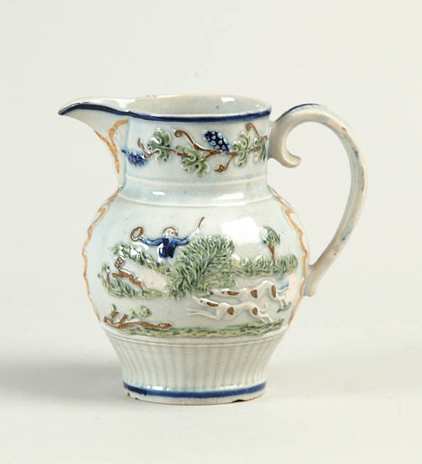 PRATTWARE TYPE SMALL PITCHER. Decorated with rabbit hunting scene on two sides. Dogs are seen scared by man in blue coat chased by two dogs. The other shows man holding rabbit, two dogs and a horse. Grapevine top border with blue line decorations. SIZE: 5-1/4” h. CONDITION: One old fleck off inside of spout, otherwise very good. 9-95319 (200-400)