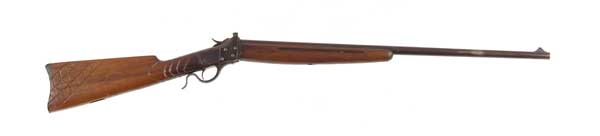 *WINCHESTER LOW WALL WINDER MUSKET. Cal. 22 short. Thin wall action musket with 28” medium weight bbl, pedestal front sight and receiver mounted peep sight. Forearm has been cut to 13-1/4” and the buttstock crudely carved. It has “US” and flaming bomb stamped behind the hammer. SN 131592. CONDITION: Fair to good, as noted, the metal retains a blue brown patina with scattered light surface rust. Wood is sound, missing the swivel with amateur varnish. Worn bore. 4-49410 JR133 (100-200)
