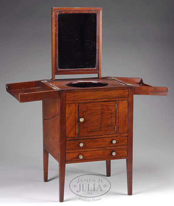 GEORGE III INLAID MAHOGANY LIFT TOP WASHSTAND. Second half of the 18th Century. The hinged top opening outwards in two sections revealing a cutout for a wash basin and an extending dressing mirror fit within the case, above the frieze with ebony stringing above a cupboard door flanked by string-inlaid panels over a long drawer above a simulated drawer, raised on square tapered legs. SIZE: 32″ h x 20″ x w x 19″ d. CONDITION: Retains old polished surfaces. Repaired and restored shrinkage cracks. Inlay intact, retains original hardware. 9-95276 (500-750)