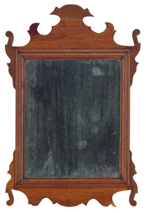 TWO EARLY MIRRORS. 1) Small Chippendale mahogany mirror. SIZE: 18” h x 12” w. CONDITION: Restored and refinished. Good. 2) Sheraton split column mirror with reverse painted house scene. Painted black, 19th Century. SIZE: 20-1/4” h x 11-1/4” w. CONDITION: Some flaking and loss to reverse painting, otherwise good. 9-72427 (150-250)