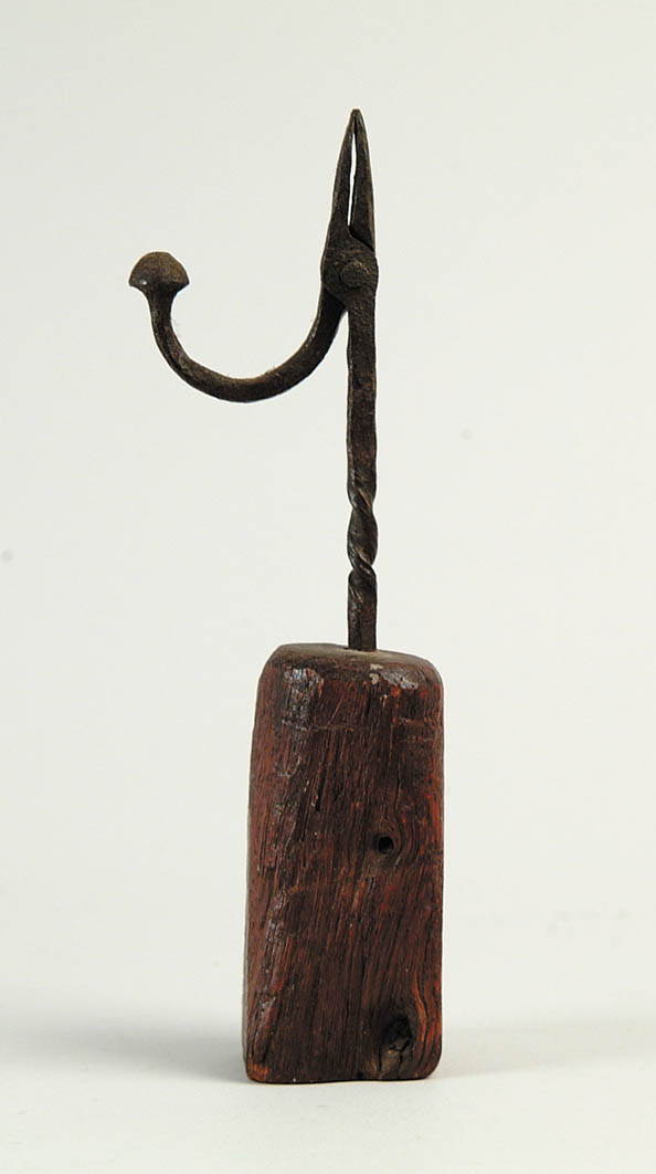 GOOD WROUGHT IRON RUSH LIGHT. Mounted in wood block having twisted post and knob holder. SIZE: 11-1/2” h. CONDITION: Very good. 9-94983 (200-400)