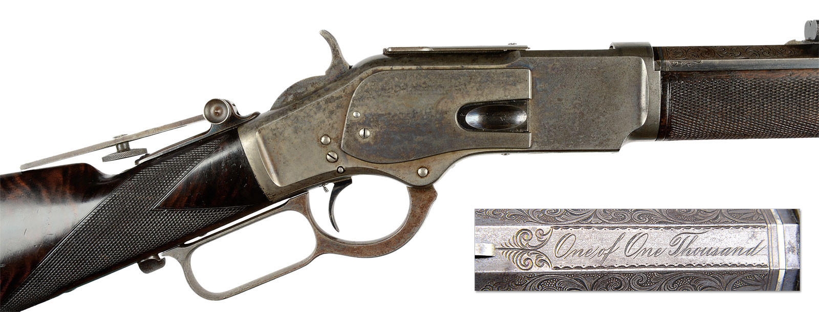 Things should really heat up on Tuesday, March 15th, which features perhaps the greatest selection of high-end, expensive guns that have come to market in quite a few years. This session will include treasures from the esteemed Collection of Paul Tudor Jones II, including his rare President Harrison shotgun which should prove to be the most significant Lefever extant. This is a Lefever Optimus 12 ga. The Optimus Grade is the highest quality shotgun ever produced by the Lefever Arms Co and this very rare treasure is estimated at $75,000-125,000. Presidential guns from the south of the United States are also represented by his extraordinarily rare Nimschke engraved and ivory stocked Model 1866 carbine with relief carved Mexican eagle. The gun was purportedly made for Emperor Maximilian and at one time in the collection of his Excellency Porfirio Diaz, President of Mexico. This superb treasure carries a $150,000-250,000 estimate. The Tudor Jones Collection also includes two very rare Winchesters. One is an 1876 1 of 100, in fine condition, it carries a presale estimate of $175,000-275,000. Also from the Jones Collection is the 1 of 1000 Model 1873 in fine condition. It too is estimated at $175,000-275,000.