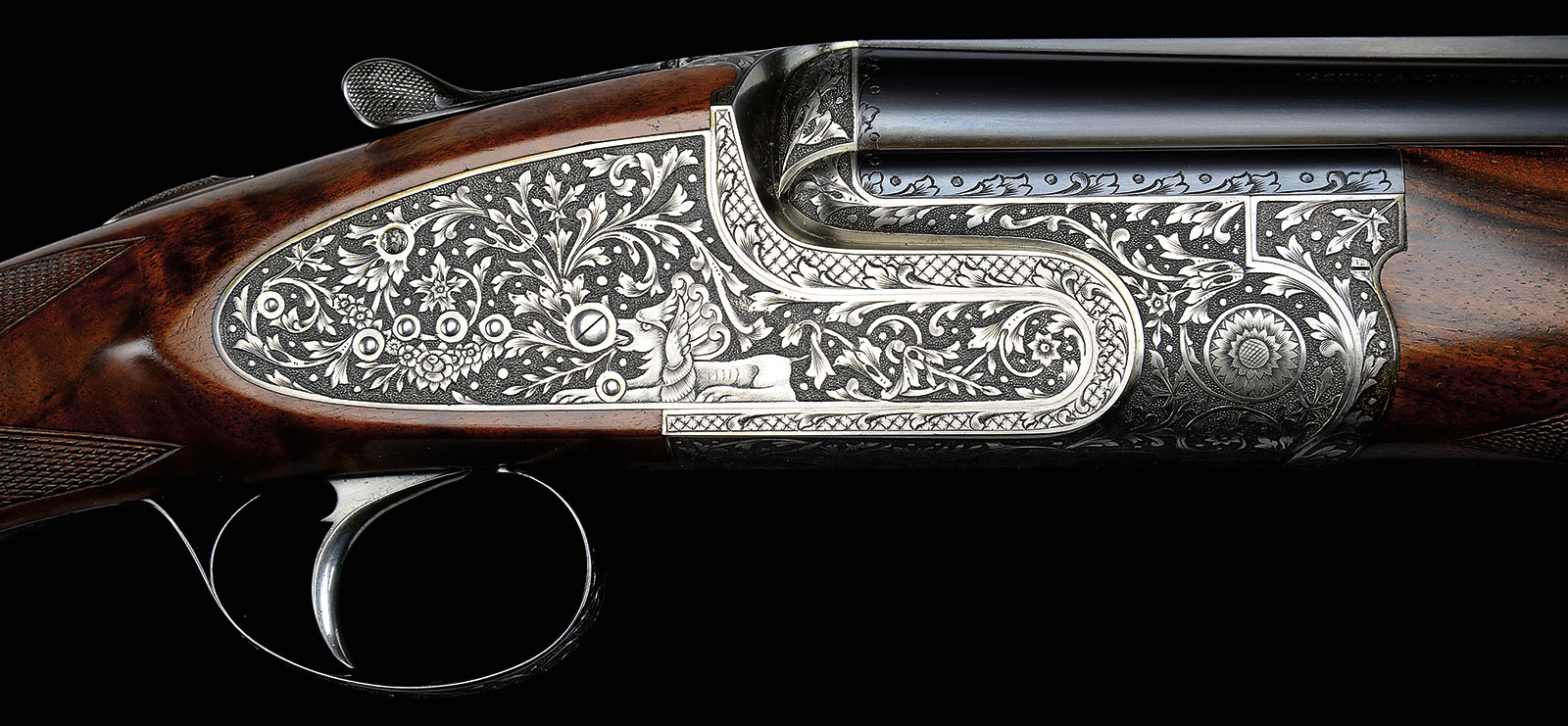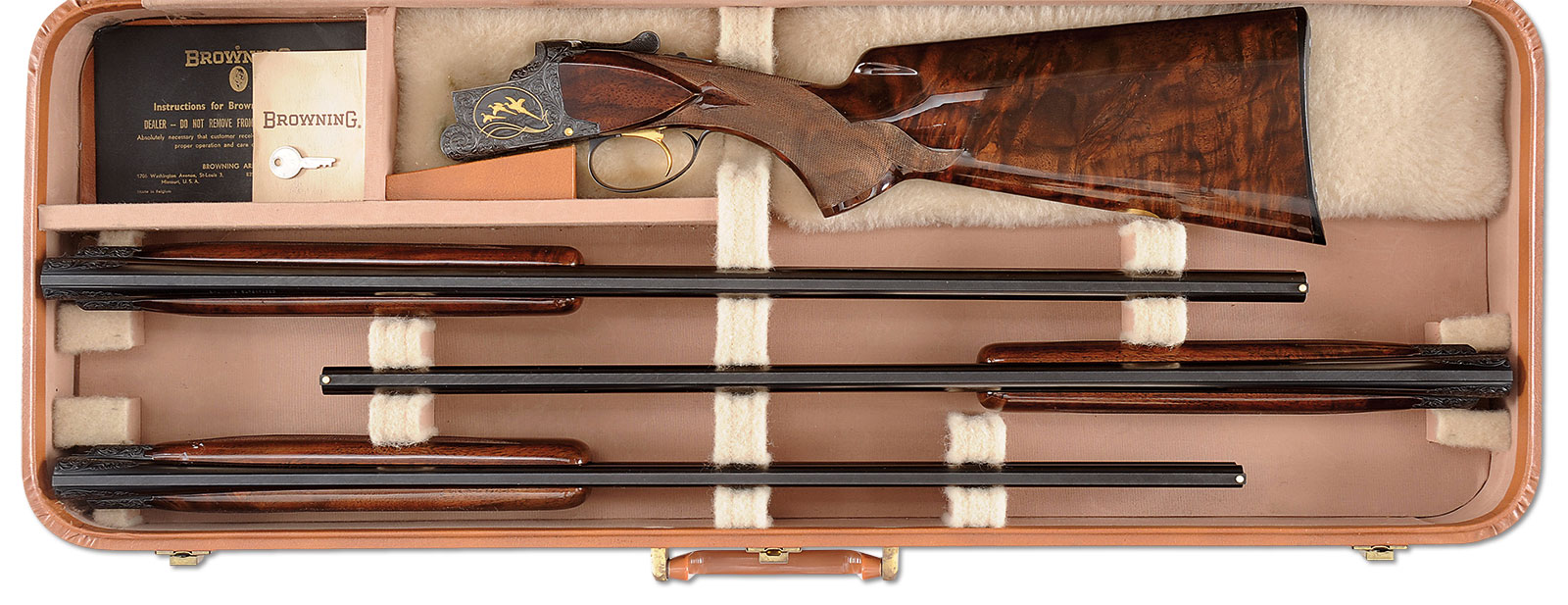 Other fine guns include a fantastic and rare L.C. Smith “All Options” Premier Grade 12 ga Trap gun at $50,000-70,000. Small bore Parker devotees will relish an extremely fine GHE grade 28 gauge at $22,500-37,500 and many .410s including an extraordinary VHE with hang tags estimated at only $20,000-30,000. Astute Winchester collectors will recognize the value of a fabulous ‘50s vintage Model 21 16ga 2-barrel set with factory #6 engraving at only $25,000-40,000.The final session of the Rod Fuller Estate Collection and select others will include fine Belgian Brownings such as highly adorned Olympian grade rifles and Midas grade shotguns in various configurations.