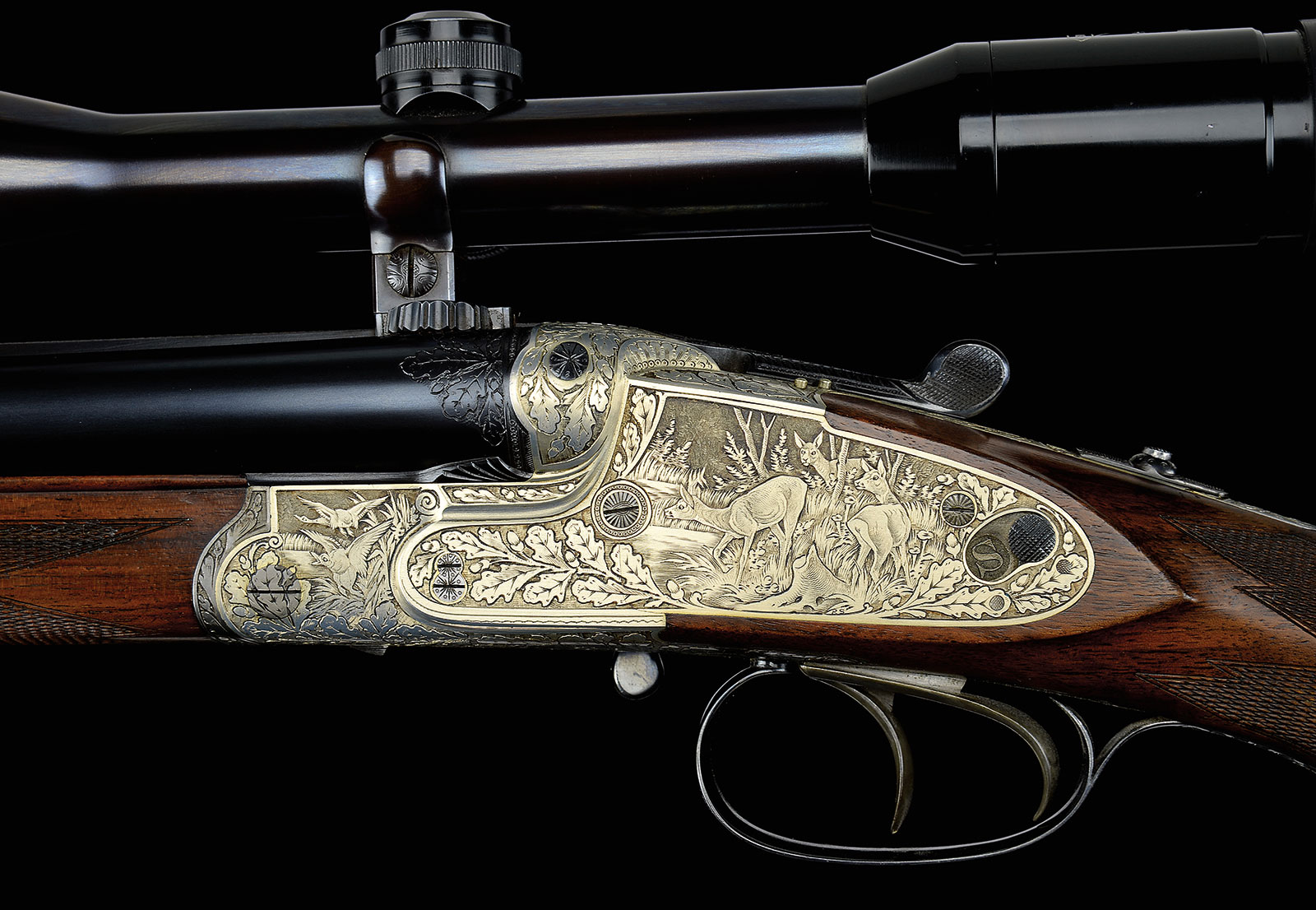From the Timothy Scott Collection of Sporting Arms is a beautiful engraved Krieghoff Ulm Brevis Double Rifle with extra combo barrels and two scopes. This excellent cased set carries a reasonable $4,000-6,000 estimate.