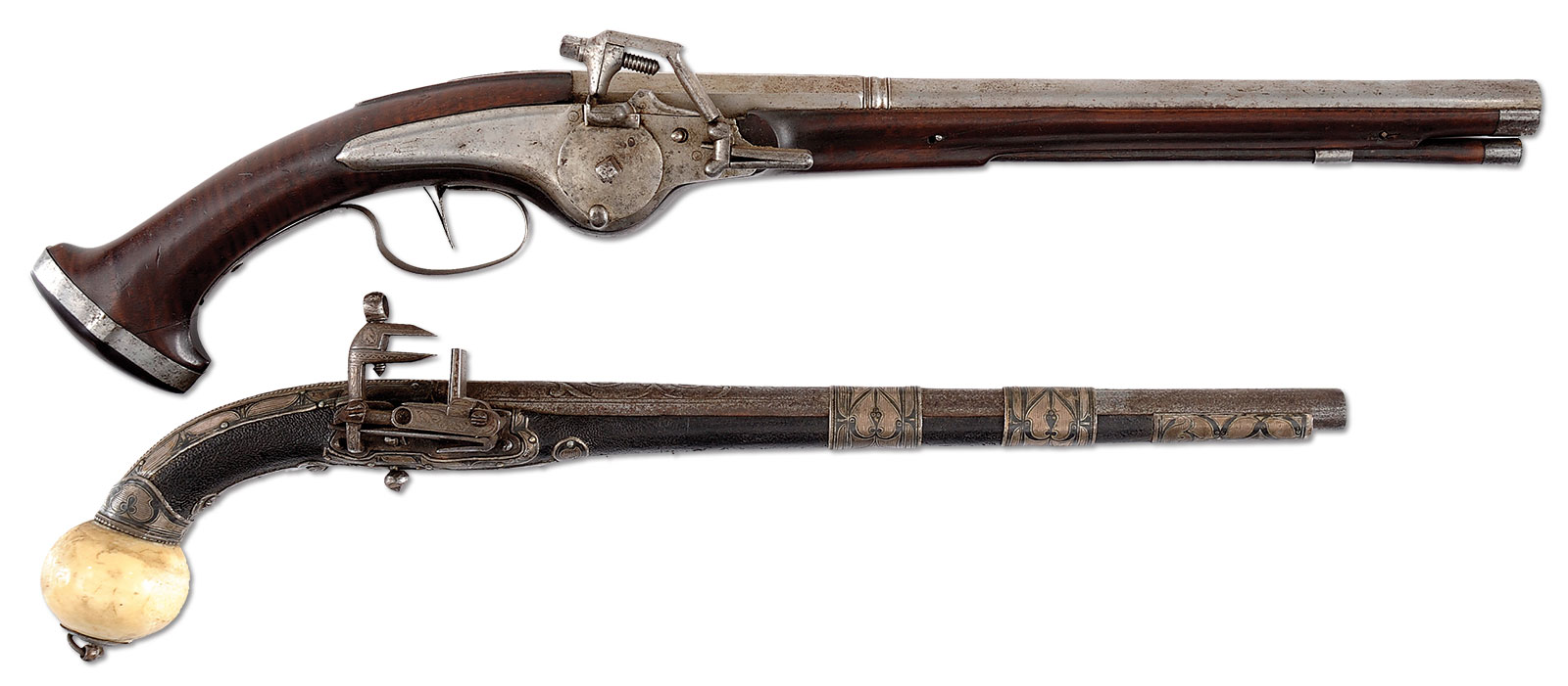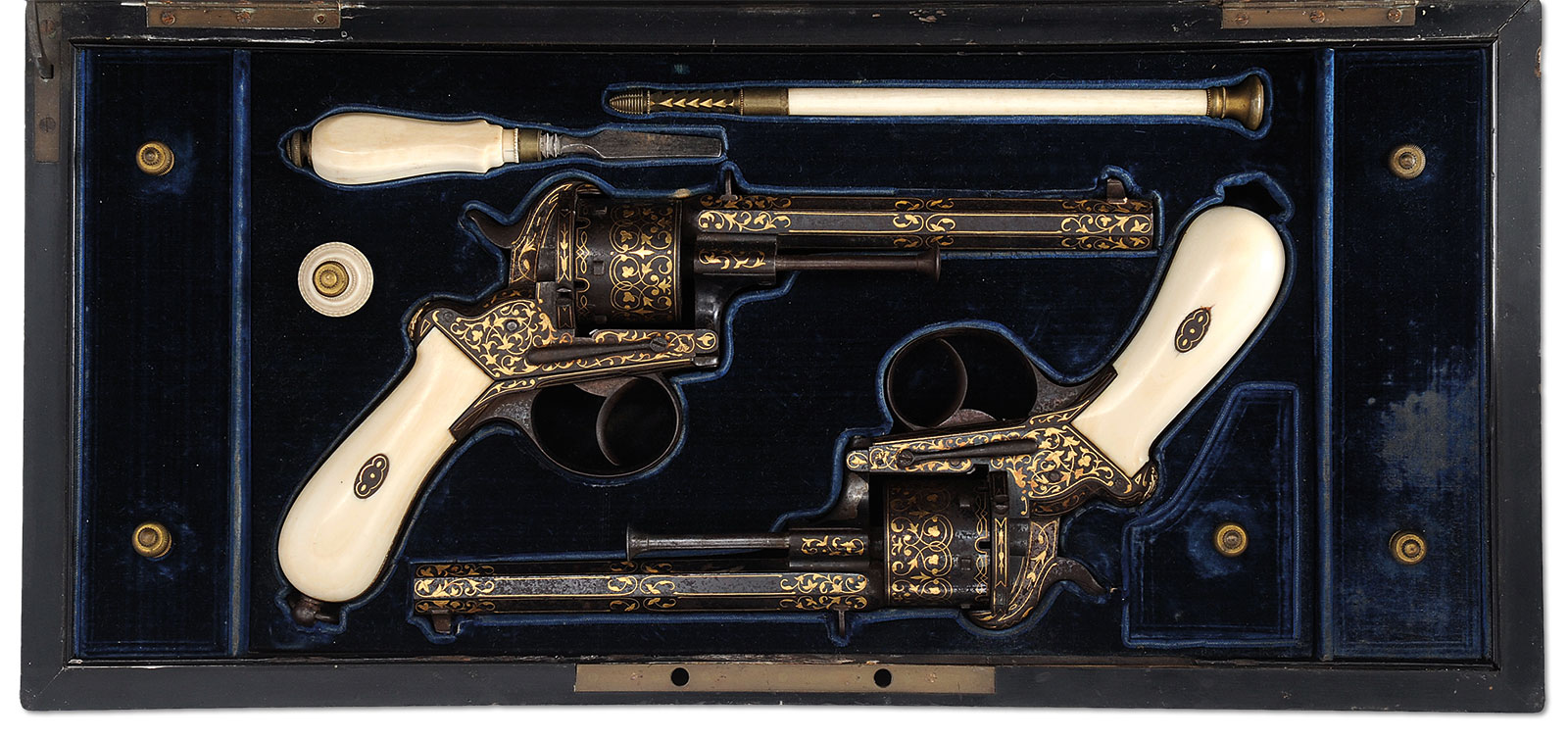 Quality early arms include a very fine cased pair of James Haslett (Baltimore) saw-handled flintlock dueling pistols, estimate of $30,000-55,000. From the Spiropoulos Estate of Nova Scotia a fabulous cased Manton marked percussion Dueling/Target/Holster ensemble in fine original condition estimated at $18,000-25,000. Important and historic cased pair of gold inlaid Maurer pinfire revolvers bearing the Serbian coat of arms ca. 1860 at only $15,000-25,000. Two fabulous early European high-art examples by the illustrious Maucher family from the mid-17th century, a superb ivory decorated flintlock pistol and an equally magnificent ornately carved Wheelock rifle both coming to the block at $60,000-80,000 each.