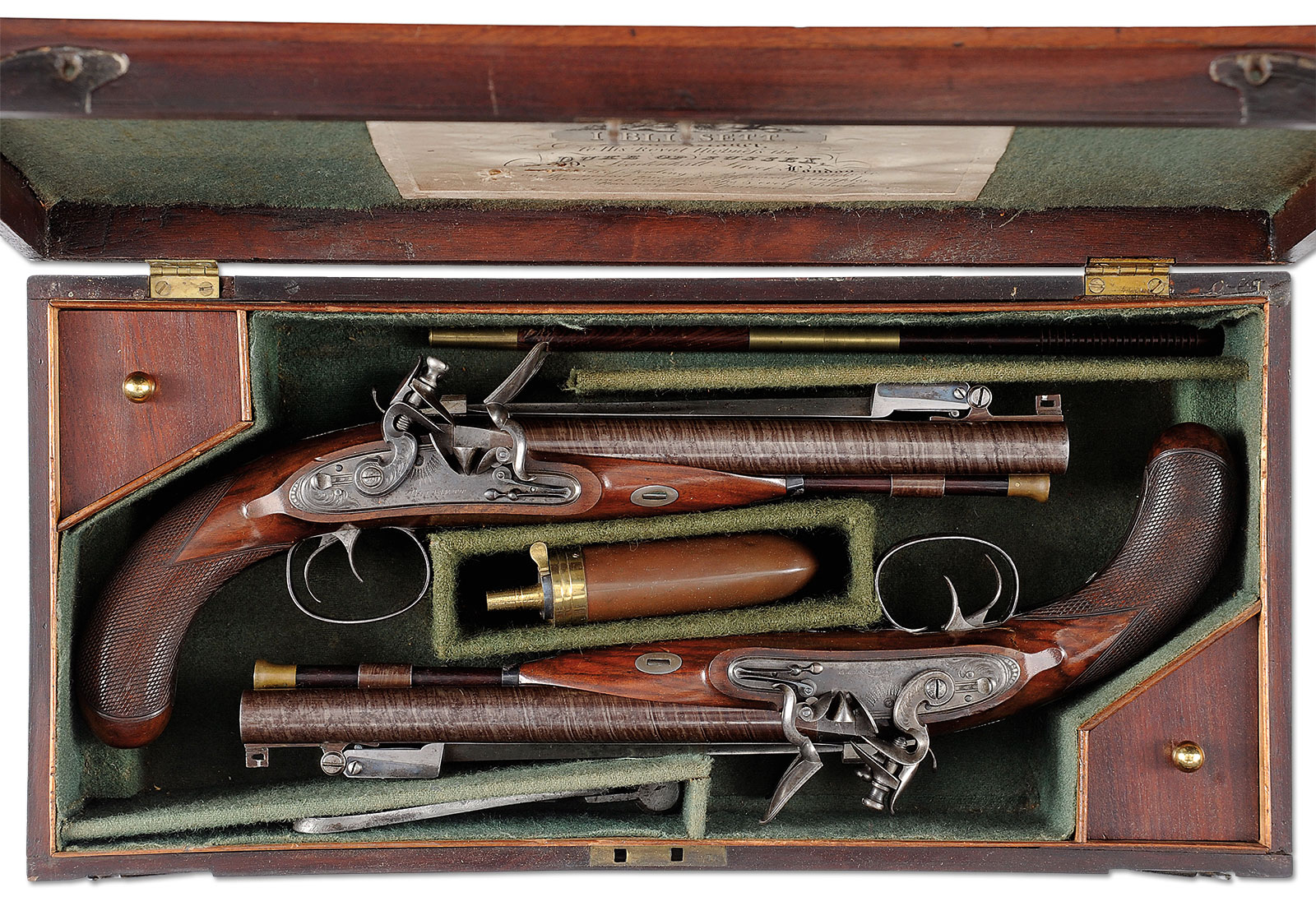 Lot 1535. Splenid Cased Pair of Flintlock Carriage Pistols with Spring Loaded Bayonets by Isaac Blissett, Sold for Auction World Record Price for Any Pair of Bayontted Carriage Pistols